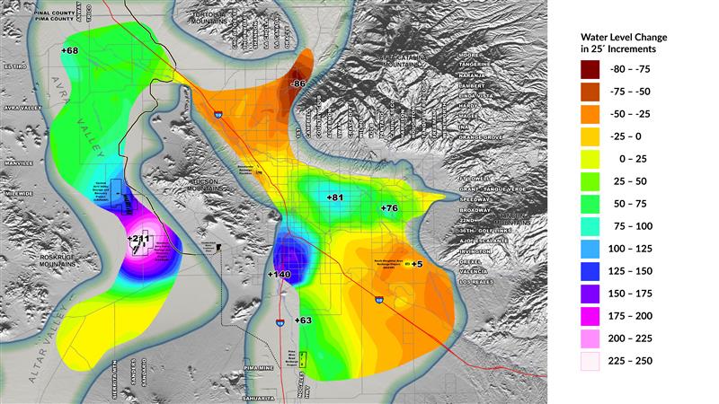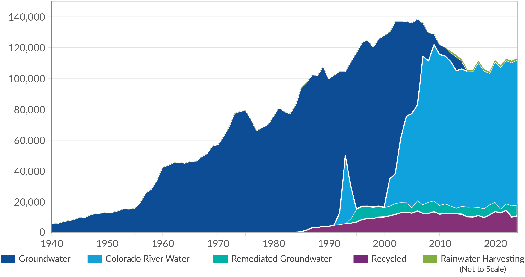 Rain and stormwater harvesting are a small but growing component of Tucson’s water supply. Although it is unmetered, the estimated amount of rain and stormwater collected is represented by the green line on top of the water production graph.